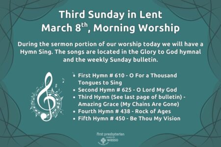 Hymn Sing Mar 8, 2026 Thirty Sunday in Lent, Morning Worship, March 8, 2026Hymn SingAccompanying Scripture: Exodus 17 : 1-7